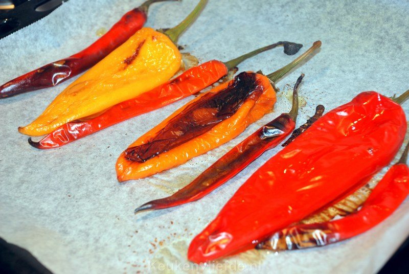 Verhit de ovengrill. Verdeel de pepers en paprika’s over een bakblik bekleed met bakpapier en schuif onder de grill. Laat het vel donker tot zwart kleuren, keer ze dan om en laat de andere kant ook kleuren.
