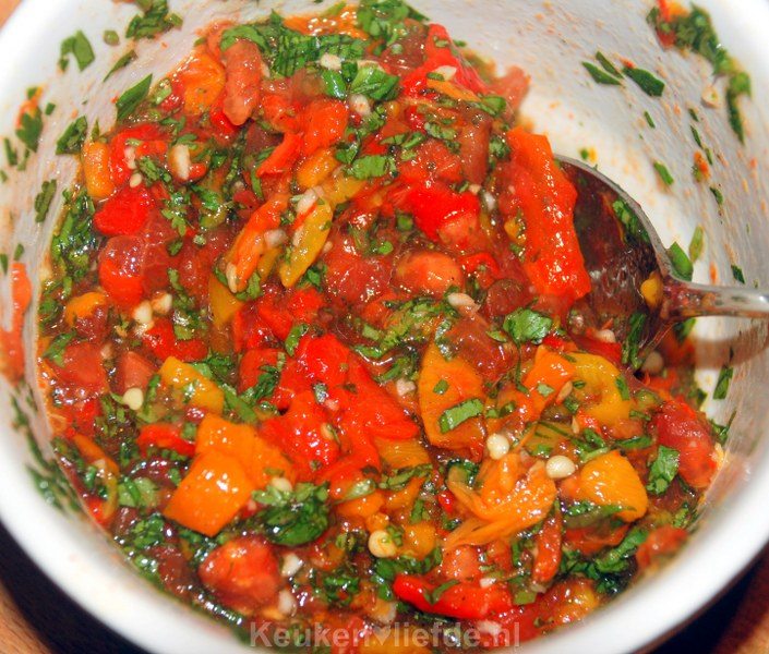 Trek het vel van de tomaten, knijp het vocht en zaad eruit en hak de tomaten fijn. Voeg samen met de knoflook en koriander toe aan de paprika’s en pepers. Breng de chilisalsa op smaak met wat olijfolie, eventueel een druppeltje rode wijnazijn, zeezout en peper.