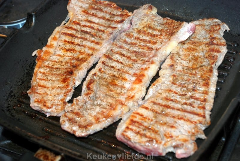 Dep het vlees goed droog met keukenpapier en wrijf het vlees in met wat zonnebloemolie, zout en peper. Laat de grillpan goed heet worden. Leg de entrecotes in de grillpan en grill ze aan iedere kant circa 1 tot 2 minuten.