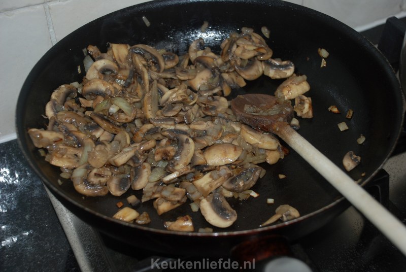 Borstel de champignons schoon en snijd ze in plakjes. Pel en snipper de ui. Verhit wat boter in een koekenpan en fruit de ui zacht. Voeg dan de champignons toe en bak ze mee totdat ze geslonken zijn en het vocht verdampt is.