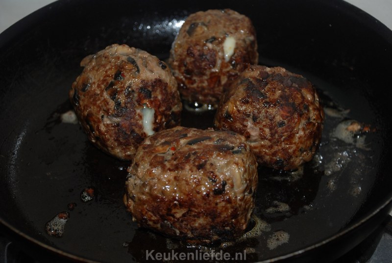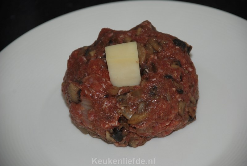 Zet het vuur uit en laat het mengsel even afkoelen. Hak de champignons en ui op een snijplank fijn met een mes. Meng alle ingrediënten, behalve de kaas, door het gehakt en draai hier 4 ronde ballen van. Als het gehaktmengsel te nat is kun je nog wat extra paneermeel toevoegen.