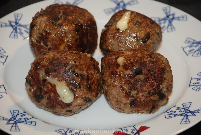 Het leuke van gehaktballen is dat je er eindeloos mee kunt variëren door steeds andere ingrediënten toe te voegen. Dit keer verstopte ik een blokje kaas in de gehaktballen. Wanneer je de gehaktbal na het braden opensnijd heb je in het midden een heerlijke kern van zacht gesmolten kaas. Mmmm…. een hele aangename verrassing!