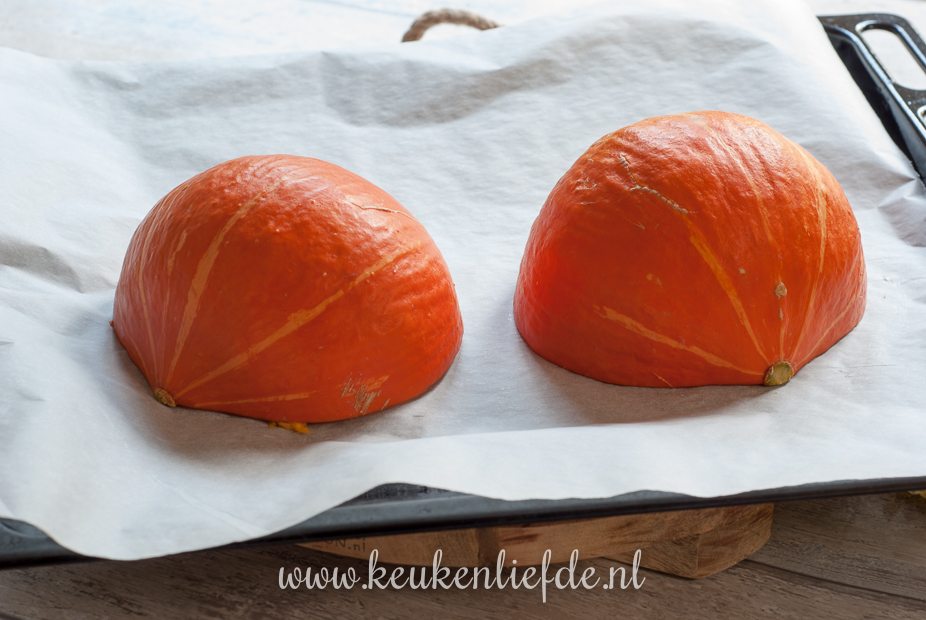 Snijd de pompoen doormidden en schep de pompoenzaden eruit. Leg de pompoenhelften (snijd een grote pompoen eventueel in meerdere parten) op een met bakpapier bekleed bakblik en bak 25 minuten in de oven, of totdat de pompoen zacht is.