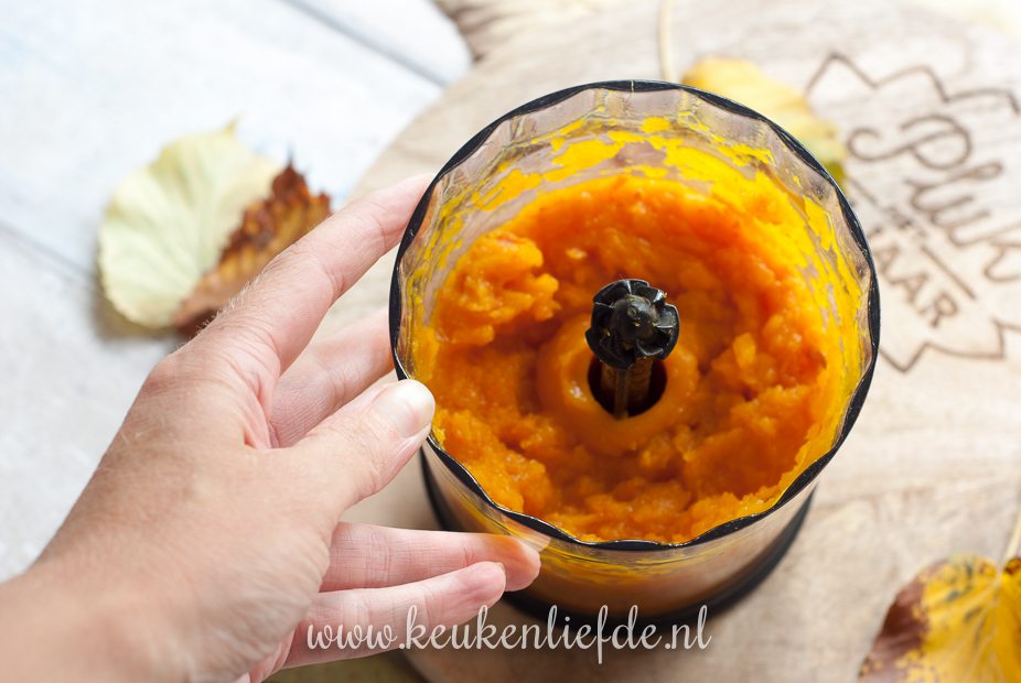 Snijd eventuele harde, of donkere stukken van de schil weg. Laat de pompoen afkoelen en pureer met de staafmixer.