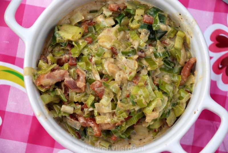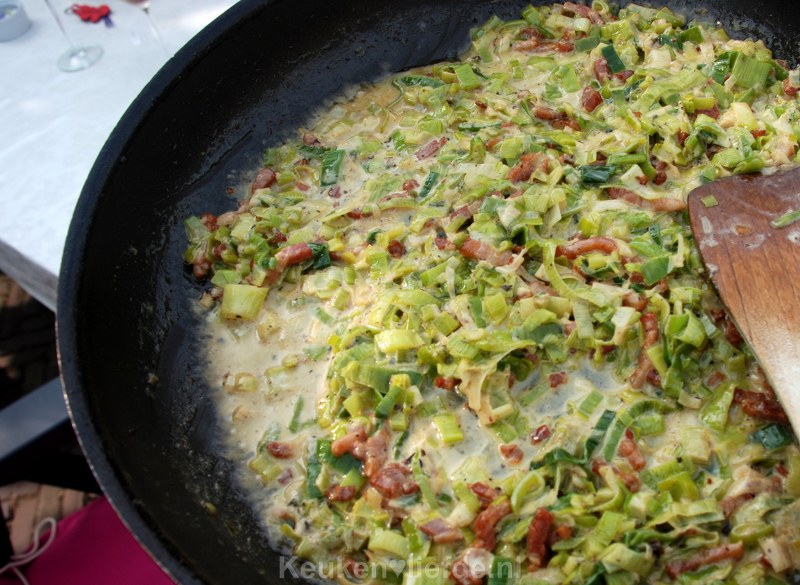 Ik heb het recept iets aangepast Tea. Je moet de prei goed droogdeppen voordat je hem gaat bakken en de saus op hoog vuur laten inkoken tot sausdikte.