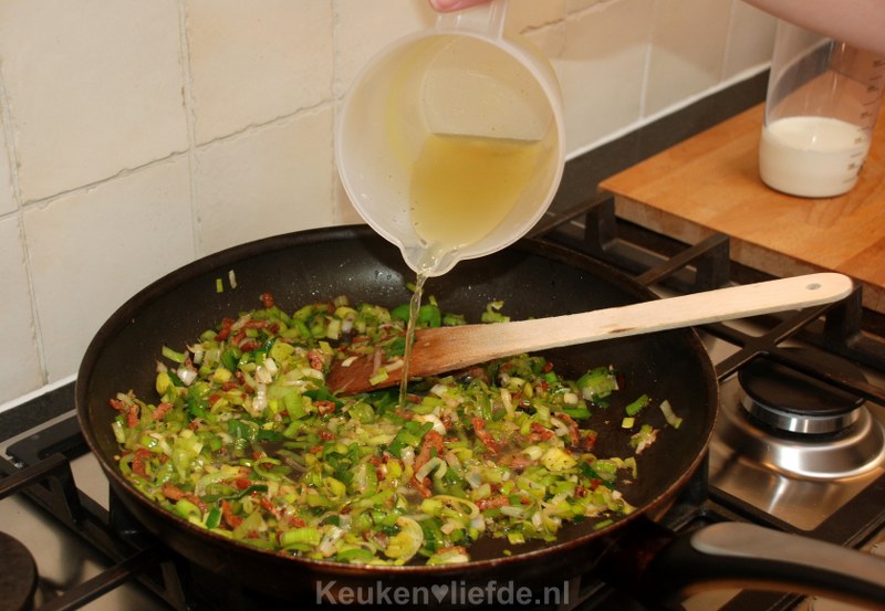 Bak de spekjes op laag vuur langzaam uit totdat ze licht beginnen te kleuren. Voeg dan de prei en knoflook toe en bak enkele minuten mee tot de prei wat zachter is. Voeg tot slot de bouillon en slagroom toe en breng aan de kook. Laat op hoog vuur inkoken tot sausdikte.