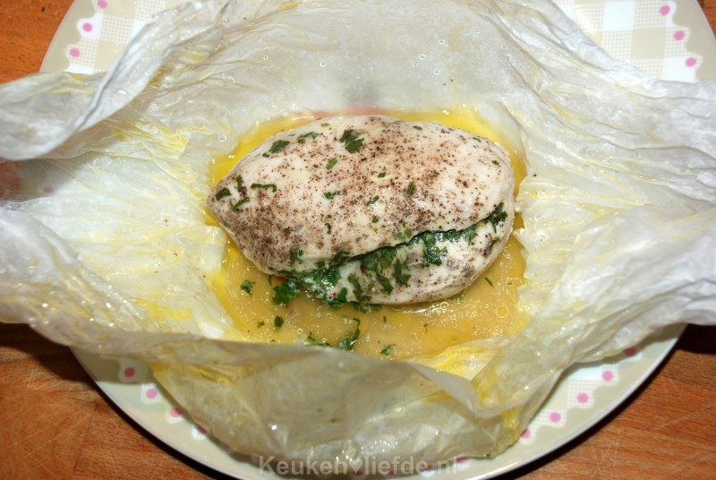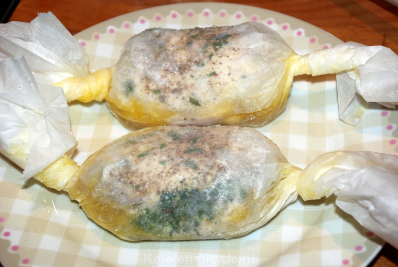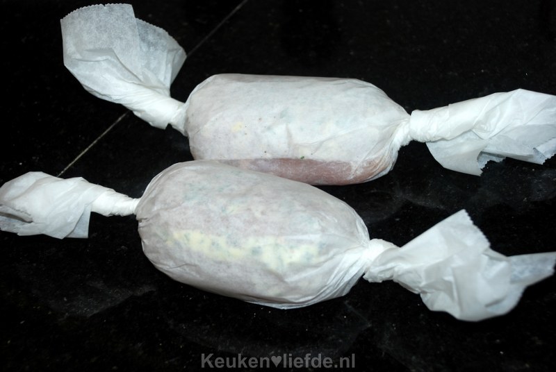 Leg de kipfilets op een vel bakpapier en rol ze op. Draai de uiteinden rond, zodat je een toffee krijgt.