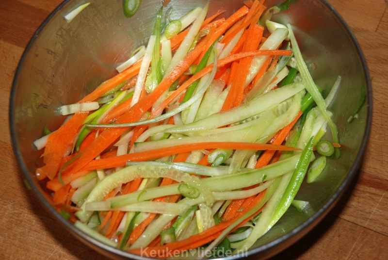 Schil of schrap ondertussen de wortel en snijd de wortel, komkommer en lente-ui julienne. Zie dit handige filmpje hierover van de AH. Meng ze in een kom met de rijstazijn, sesamolie en breng op smaak met zout en peper.