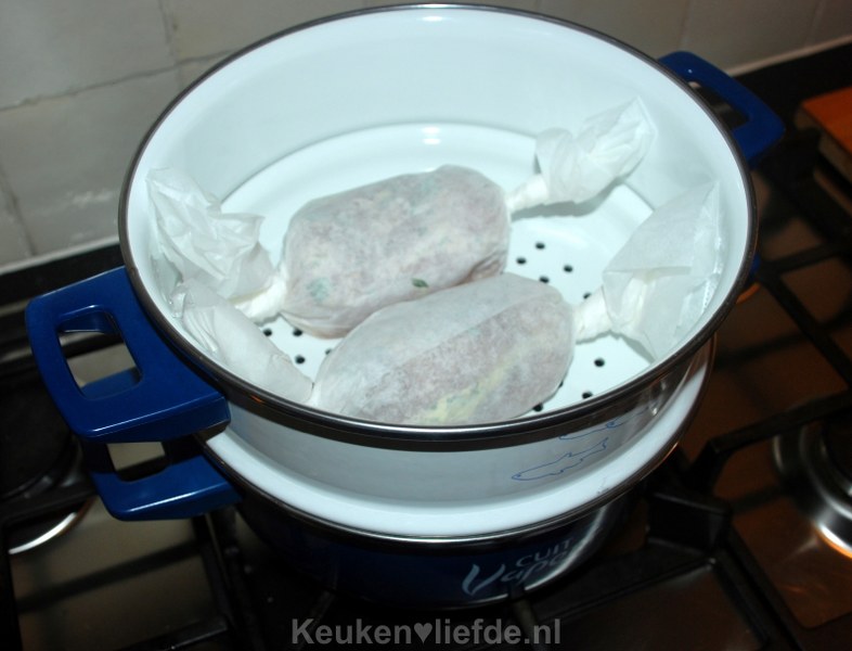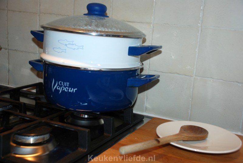 Vul een andere pan, waar de stoompan op past, met water en eventueel een bouillontablet en breng dit aan de kook. Zet de stoompan met de kip er bovenop en stoom de kip en kook de rijst gaar in ongeveer 15 – 18 minuten.