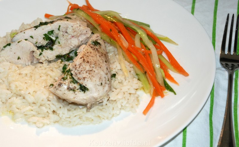 Dit is één van mijn favoriete gerechten om te maken op een drukke doordeweekse dag. Het is makkelijk en snel klaar te maken en smaakt waanzinnig lekker! De kipfilet blijft door het stomen ongelofelijk sappig en krijgt door de pittige koriandervulling een verrukkelijke Oosterse smaak. Door de groenten julienne (lucifer dunne reepjes) te snijden en te marineren in sesamolie en rijstazijn blijven ze knapperig en zijn ze heerlijk fris van smaak.