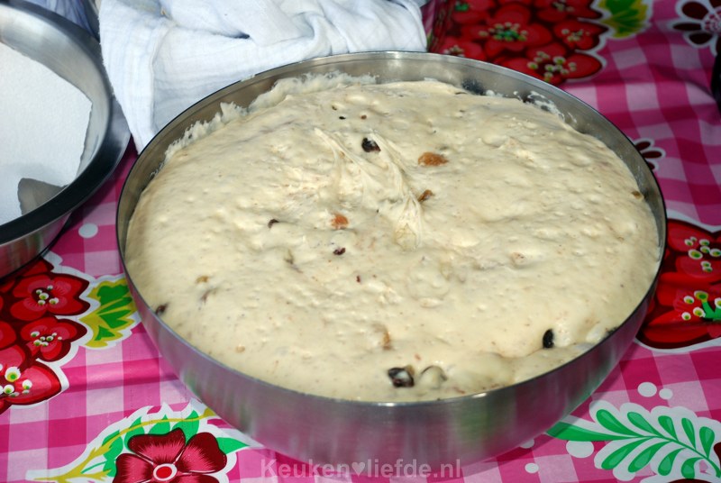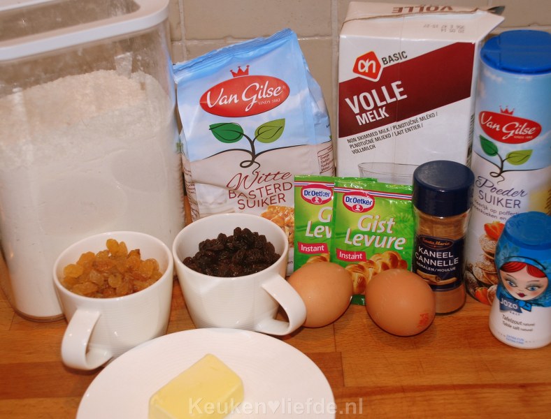 Giet heet water over de rozijnen en laat ze weken. Verwarm de melk in een pannetje totdat hij warm maar niet heet is. Meng de gist met de suiker en voeg een flinke scheut warme melk toe. Roer even goed door en laat staan. Na een minuut of 10 zal er een dikke schuimlaag op de gist komen.