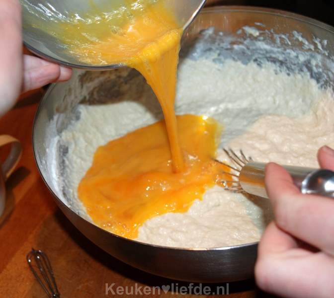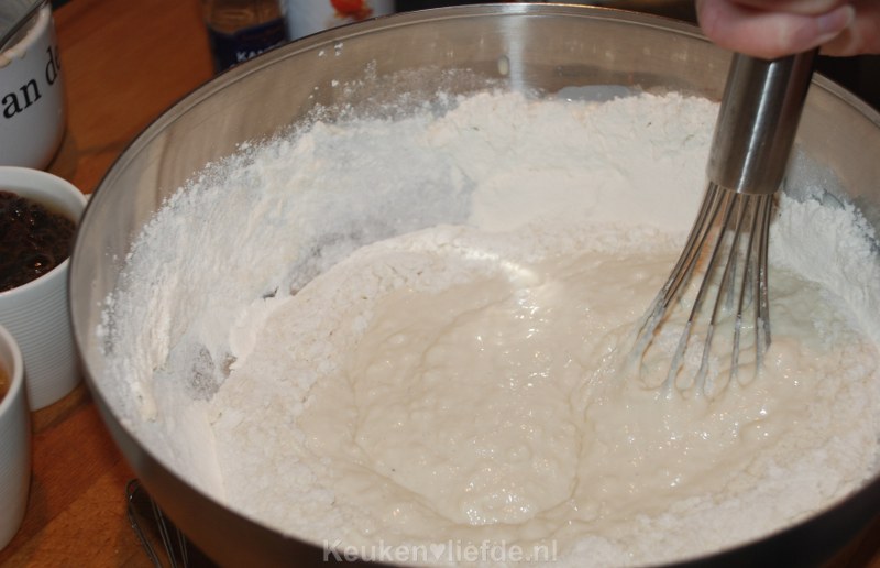 Maak een kuiltje in het midden van de bloem en voeg de gist en de overige warme melk toe. Roer met een garde vanuit het midden, zodat je steeds een beetje bloem mee roert.