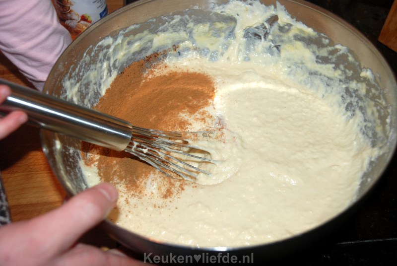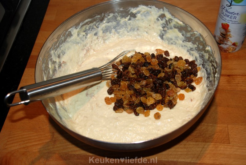 Voeg het ei toe, klop weer even verder en voeg dan de boter, rozijnen en kaneelpoeder toe.