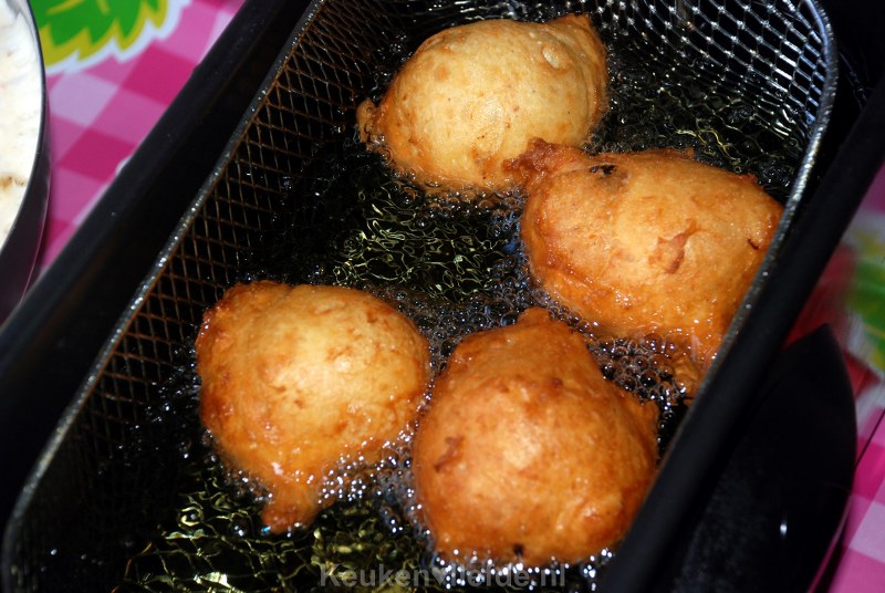 Schep de oliebollen na enkele minuten om en bak nog een paar minuten verder. De oliebollen moeten rondom goudbruin zijn.