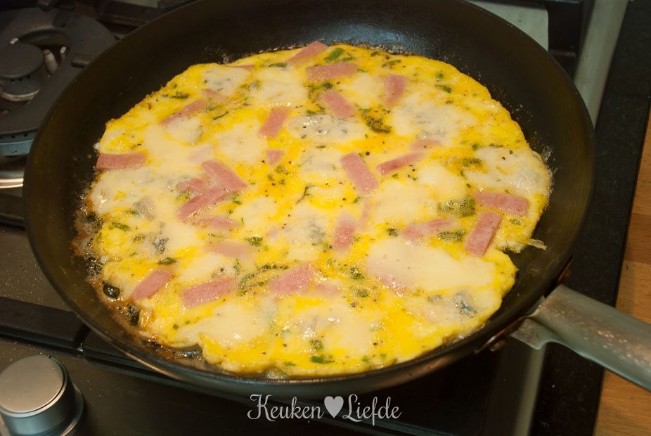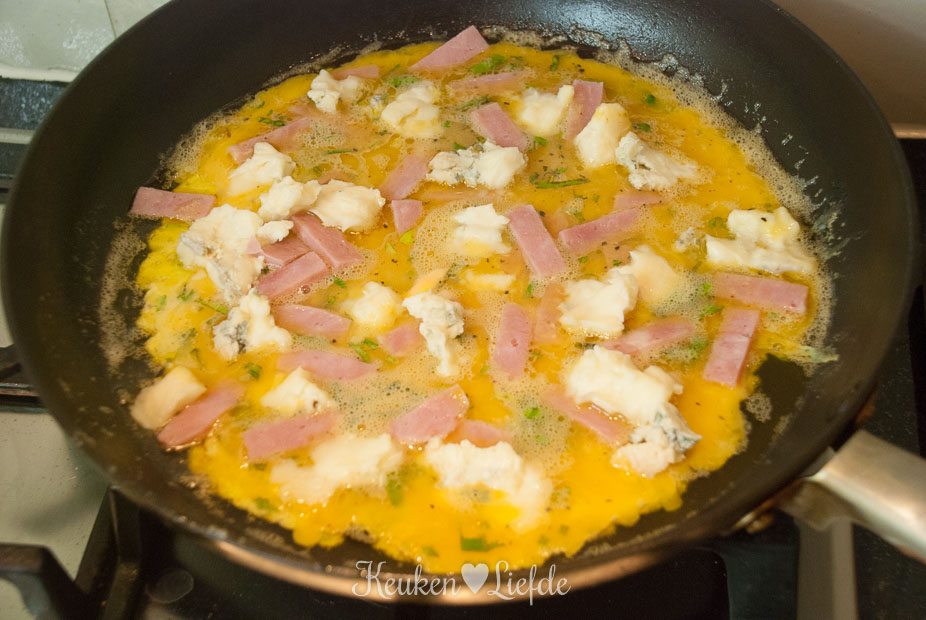 Verhit een koekenpan met wat olijfolie en laat warm worden. Klop de eieren los met zout, peper en de peterselie en giet dit in de koekenpan. Zet het vuur laag en verdeel de beenham en kleine brokjes gorgonzola over het ei. Doe de deksel op de pan en laat de omelet stollen (ik vind het lekker als de bovenkant nog heel licht vochtig is).