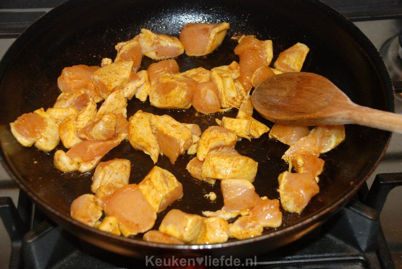 De kip hoeft niet helemaal gaar te zijn omdat hij straks nog de oven in gaat. Schep de kip op een bord en zet zolang opzij.