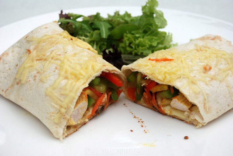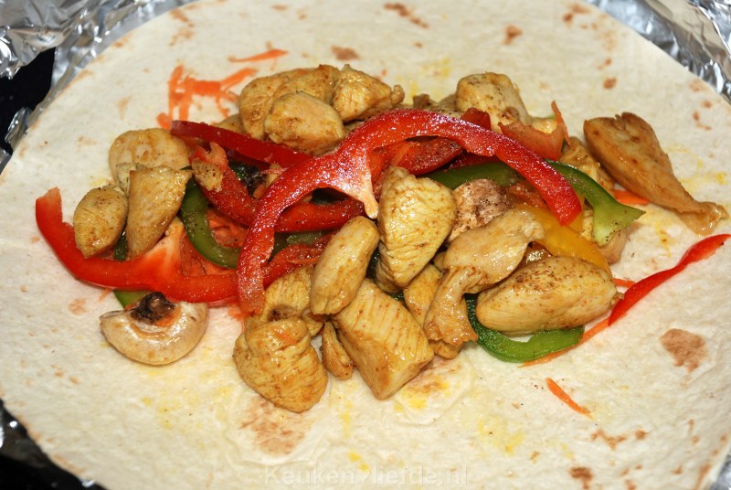 Veeg de koekenpan schoon met een stukje keukenpapier en verhit de pan opnieuw met wat olie. Bak dan de paprika’s en champignons op hoog vuur totdat ze beetgaar zijn en beginnen te kleuren. Breng op smaak met zout en peper. Zet het vuur uit, voeg de kip toe en meng alles door elkaar. Beleg de wraps met het kip mengsel, wat geraspte wortel en geraspte kaas en vouw ze dicht.