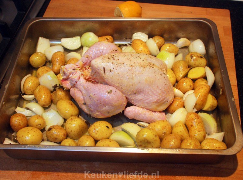 Leg de kip in de braadslee (borstkant naar beneden) en verdeel rondom de krieltjes, uien en knoflook. Knijp het sap uit de citroen en verdeel over de kip en aardappels (je hoeft niet al het sap te gebruiken). Stop de citroen in de holte van de kip en bindt de kip op met keukentouw. Besprenkel de kip en aardappels royaal met olijfolie en strooi de overige kruiden over de aardappels. Bestrooi de aardappels royaal met zout uit de molen.