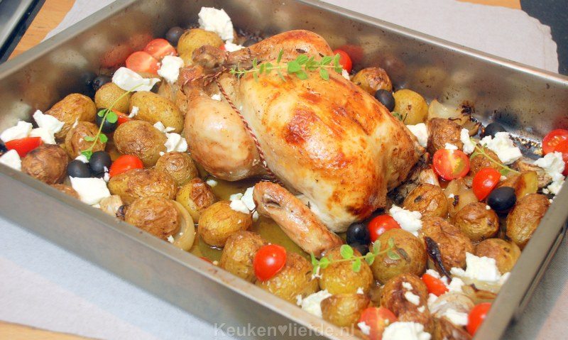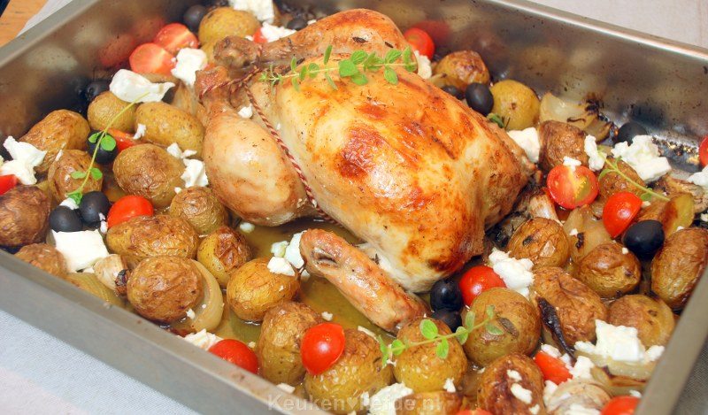 Braad de kip circa 70 minuten in de oven (afhankelijk van de grootte van de kip), of totdat het vocht dat uit de kip komt, helder is. Haal de kip elke 15 minuten uit de oven en bedruip hem met het braadvocht. Draai de kip de laatste 15 minuten van de braadtijd om, zodat ook de borstkant goudbruin wordt. Voeg de laatste twee minuten van de braadtijd de fetakaas, olijven en tomaten aan de kip toe.