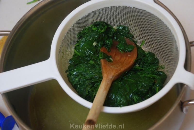 Schep de spinazie in een zeef en duw het vocht eruit.