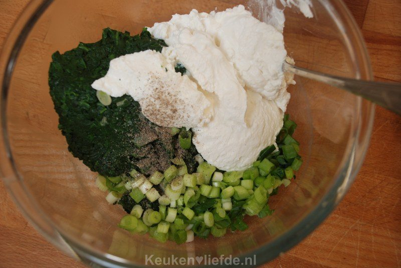 Hak de spinazie op een snijplank, met een groot mes fijn. Meng de spinazie in een glazen of houten kom (geen metalen!) met de ricotta, lente-ui, nootmuskaat en breng goed op smaak met zout en peper.