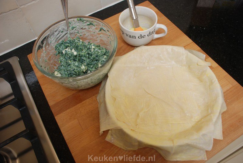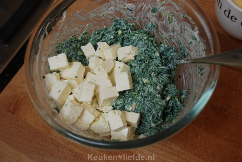 Roer tot slot de feta erdoor, houd een paar blokjes feta achter de hand. Probeer jezelf in toom te houden en niet teveel van dit spinaziemengsel te proeven, het is namelijk goddelijk lekker!