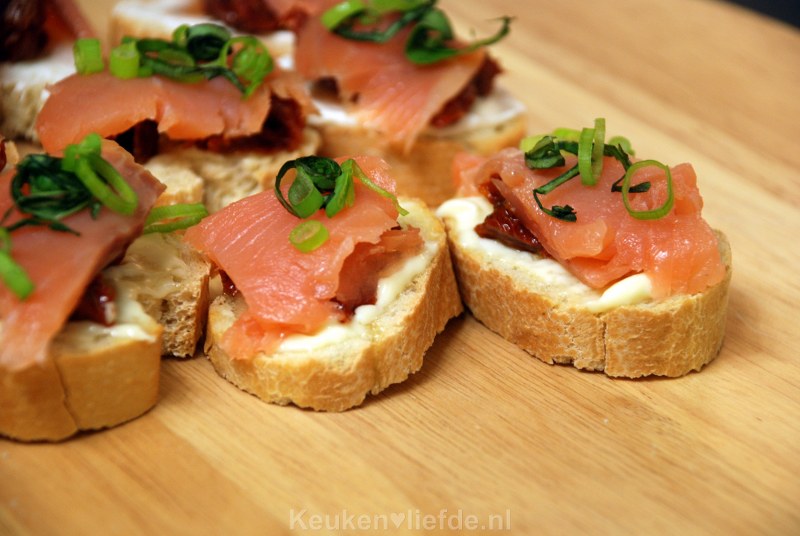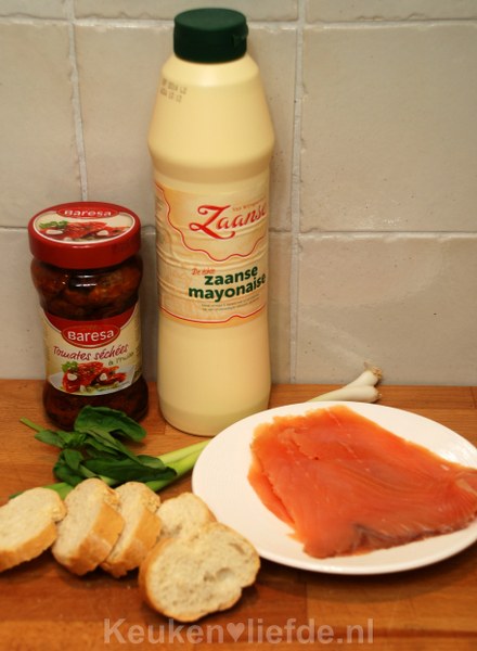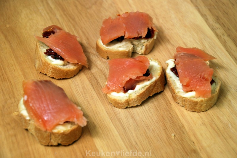 Besmeer het stokbrood met wat mayonaise en beleg met de zongedroogde tomaat en zalmsnippers.