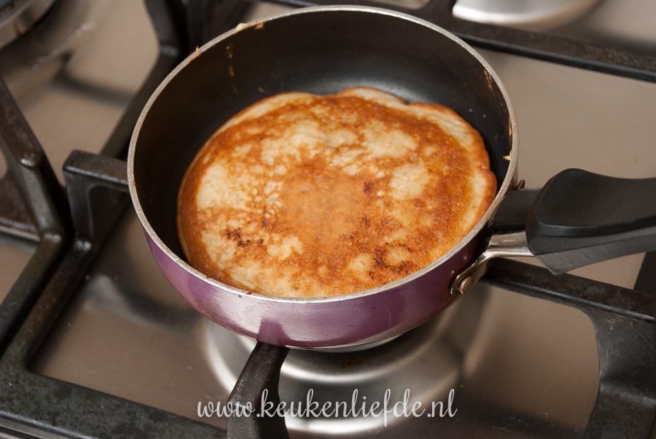 Meng de Quaker Oats, bakpoeder, melk en het ei goed door elkaar. Schenk van het beslag vier bergjes in de koekenpan, of gebruik een kleine koekenpan en bak er één tegelijk.