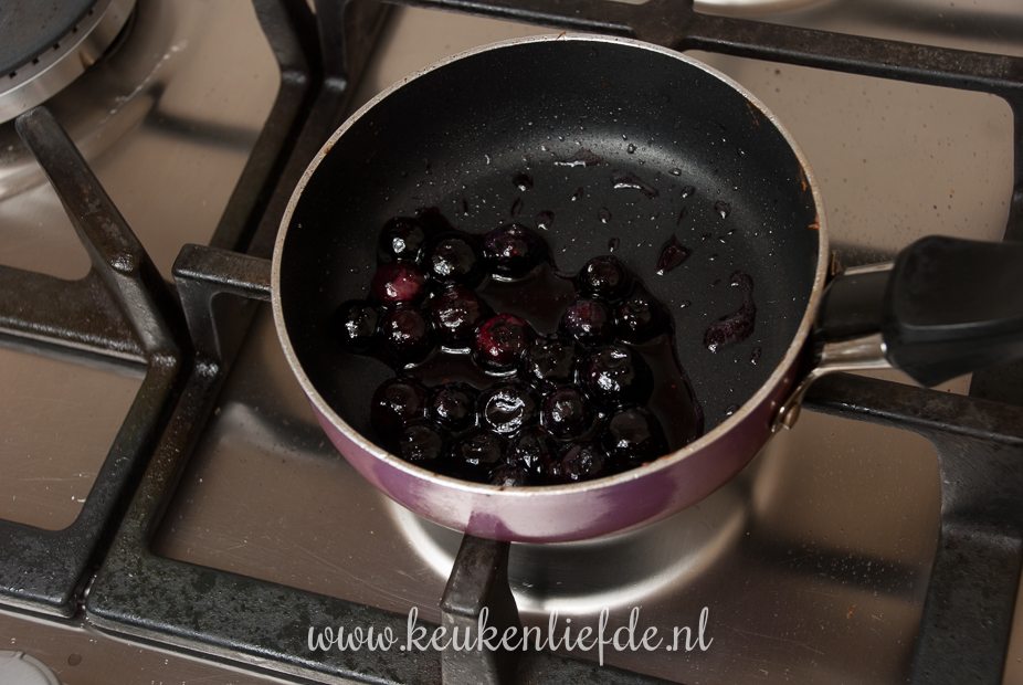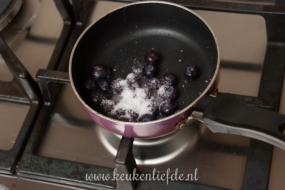 Bak de pannenkoekjes licht goudbruin en keer ze om. Bak de andere kant goudbruin. Stapel de pannenkoekjes op een bord boven op elkaar. Doe de blauwe bessen, samen met de suiker in de koekenpan en verhit, totdat de suiker is opgelost en de blauwe bessen hun sap loslaten.