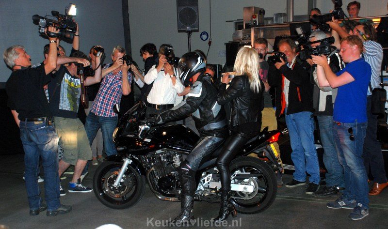 En toen de entree. BN’er Manuëla Kemp wordt per motor binnengereden met in haar handen het eerste vaatje nieuwe haring.