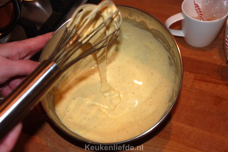 Klop de eigelen met 1 tl mosterd en een snufje zout en peper, 1 minuut in de keukenmachine (kloppen met de hand kan ook, maar dit duurt langer). Verhit het citroensap en de azijn in een steelpannetje en laat tot de helft inkoken. Voeg de hete vloeistof al mixend en heel langzaam (bijna druppelend) toe aan het eigeel. Laat ondertussen de boter in het steelpannetje smelten en voeg dit ook langzaam en al mixend toe aan het eimengsel. Als het goed is heb je uiteindelijk een licht gebonden saus. Serveer de saus direct.