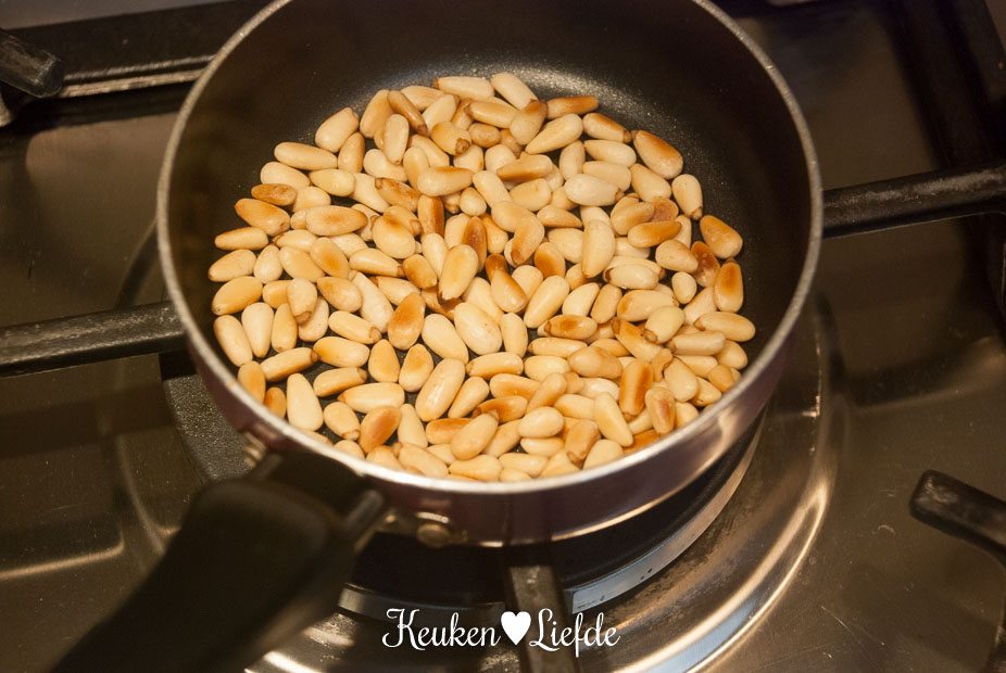 Rooster de pijnboompitten licht goudbruin in een droge koekenpan op middelhoog vuur. Blijf erbij en blijf de pan bewegen, want pijnboompitten verbranden snel.