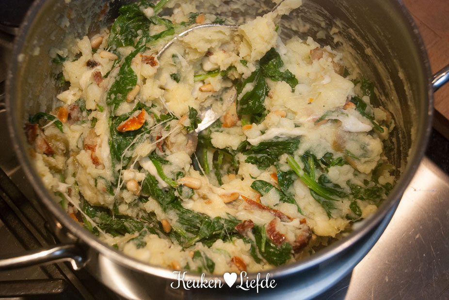 Voor een niet vegetarische variant kun je deze stamppot serveren met plakjes serranoham. Erg lekker!