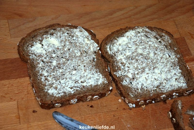 Verwarm de oven voor op 200 graden. Smeer 2 sneetjes brood in met wat boter en schaaf wat plakken kaas.
