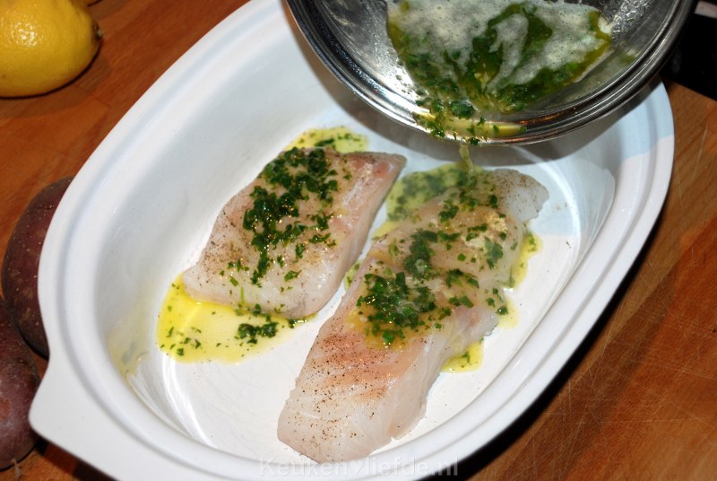 Controleer met je vingers de kabeljauw op graat en verwijder deze. Bestrooi de kabeljauw aan beide kanten met zout en peper en leg ze in de ovenschaal. Giet er een beetje gesmolten boter (niet alles) over.