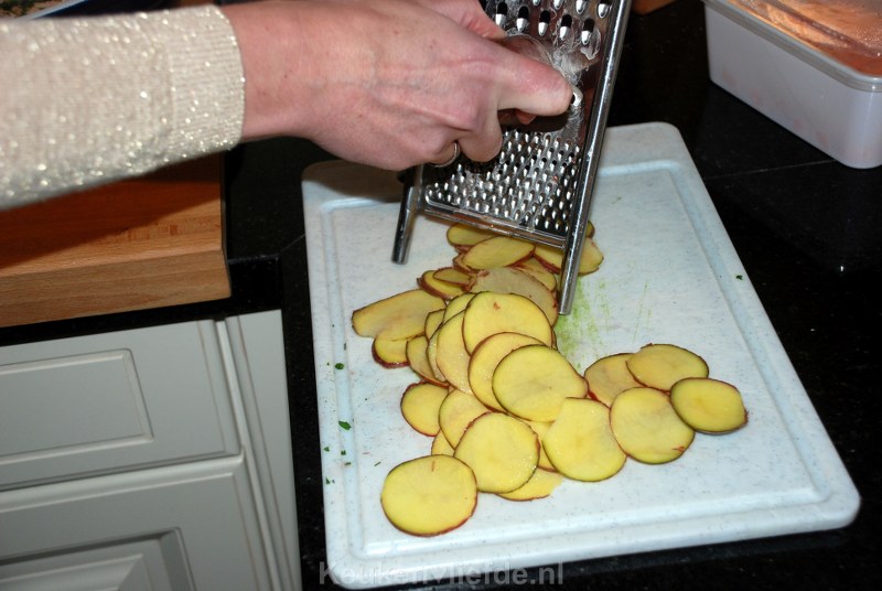 Was de aardappel en dep droog. Snijd of rasp de aardappel met schil in flinterdunne plakjes.