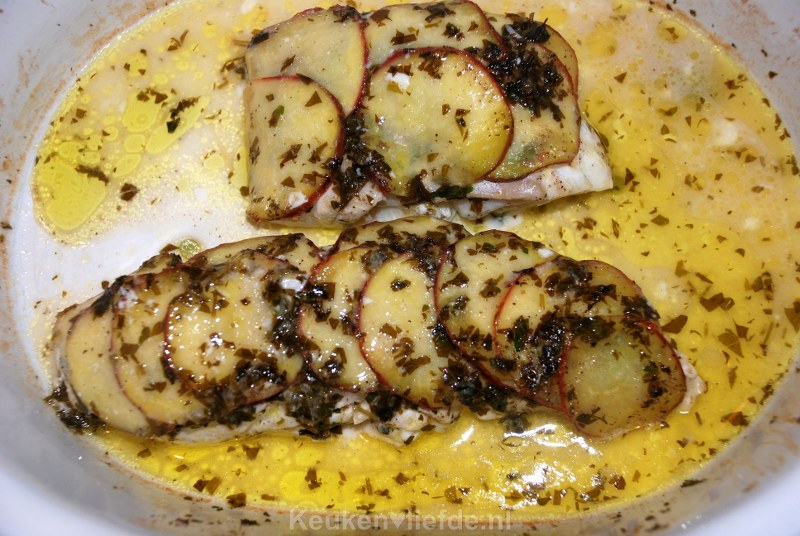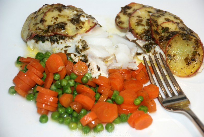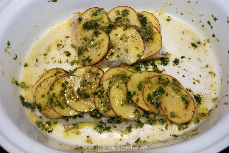 Zet de schaal ongeveer 15-20 minuten in de oven of totdat de vis net gaar is en nog glanzend vanbinnen en de aardappel licht goudbruin gekleurd.