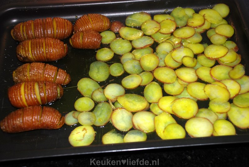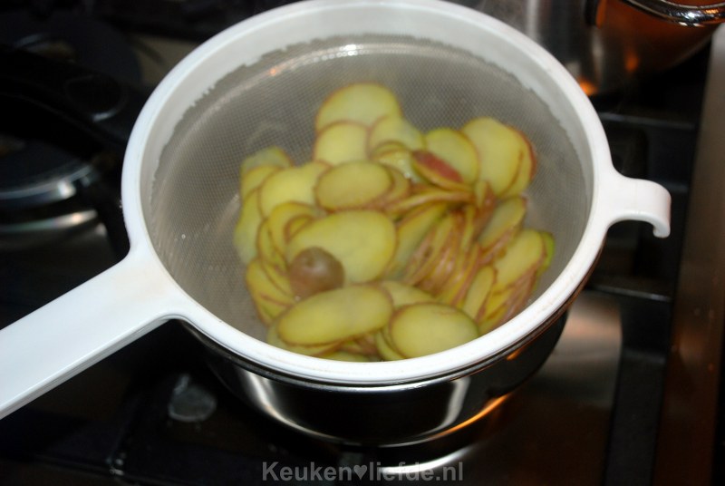 Verwarm de oven voor op 200 graden. Boen de aardappels schoon onder de kraan en dep ze goed droog. Rasp of snijd de aardappels met schil in flinterdunne plakjes en blancheer ze ongeveer een minuut in licht gezouten kokend water.
