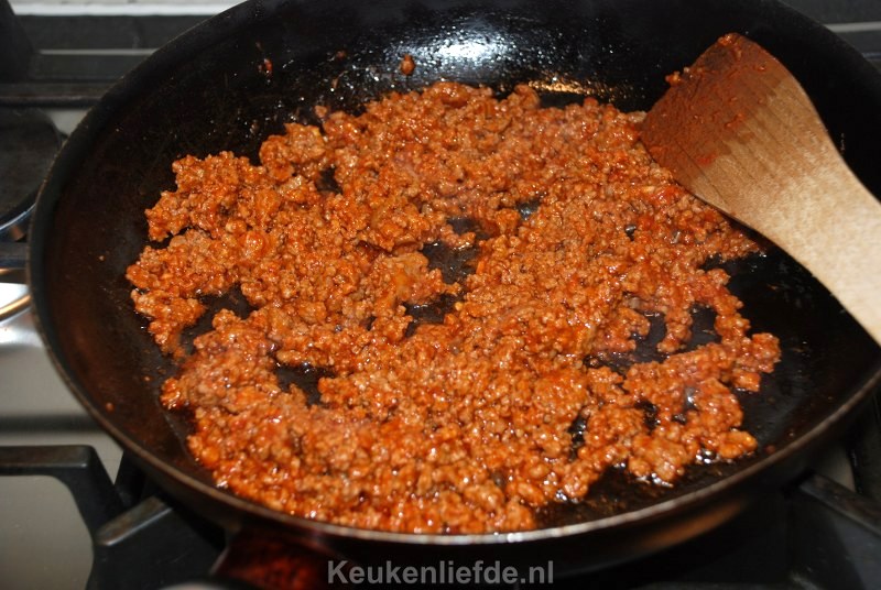 Verhit een koekenpan met wat olie en bak het gehakt rul samen met de shoarmakruiden en de tomatenpuree.