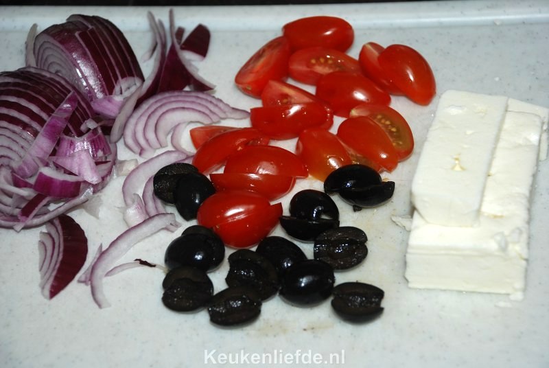 Beleg verder met de overige ingrediënten en verbrokkel tot slot de fetakaas erover.