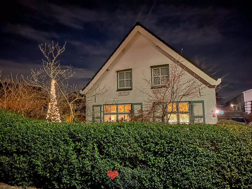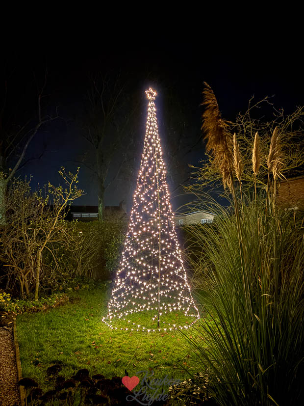 Op het laatste moment voor kerst had Johan als verrassing voor mij een kerstboom in de tuin gezet, omdat ik klaagde over het feit dat ons huis als enige in de straat geen kerstverlichting aan de voorkant had. Door de haag voor het huis zie je boom maar net vanaf straat, maar vooruit. We zijn verlicht!