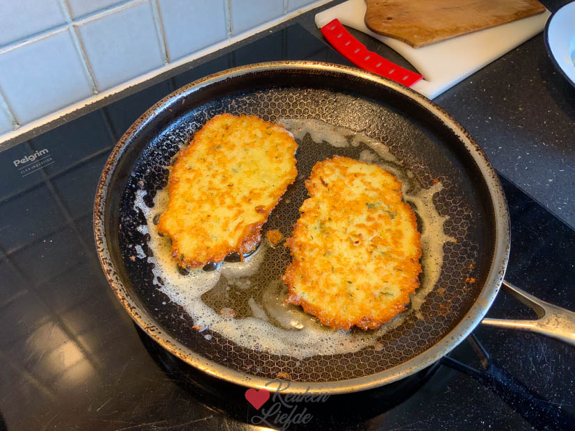 Een lekker broodje kipburger met chicken tenders van de Lidl (diepvries) en frietjes, en een gebakken kaasschnitzel met salade en krieltjes. En mijn moeder stuurde een foto door toen ze reibekuchen aan het bakken was. Hmmm, zo lekker.