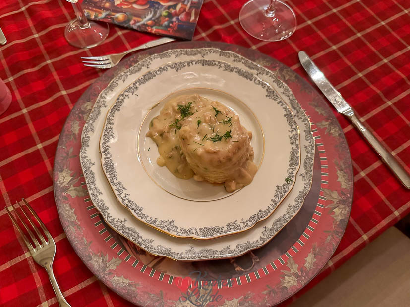 Op kerstavond gingen we zoals altijd naar mijn ouders. Mijn moeder had als voorgerecht pasteitjes met garnalenragout gemaakt. Ik had gevulde kalkoen besteld bij Boers & Boers die ik meenam samen met zelfgemaakte rodekool en een grote braadslede met groenten en erbij hadden we aardappelkroketjes en stoofperen van mijn moeder. En we sloten af met een lekkere taart gemaakt door mijn broer. Tonnetjerond gingen we ’s nachts weer huiswaarts.