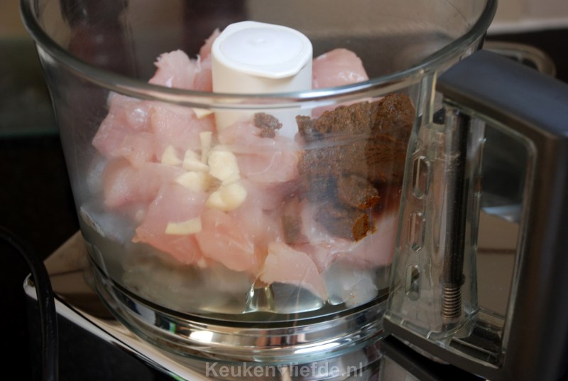 Doe de kip, garnalen, eiwit, knoflook, currypasta en panko in de keukenmachine en hak fijn tot een dikke puree.