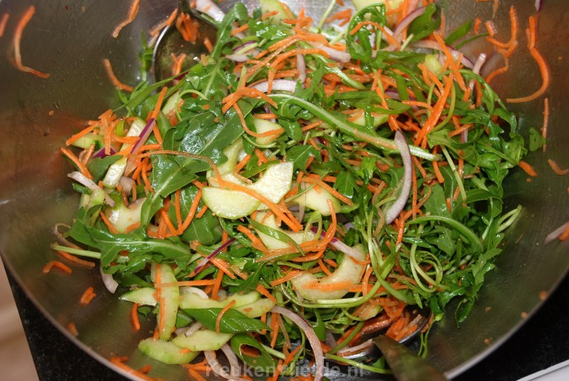 Wij aten er een salade bij van wat zachte sla, wortelreepjes, komkommer en fijngesneden rode ui, op smaak gemaakt met wat sesamolie en een paar druppels van de zoete chilisausdip.