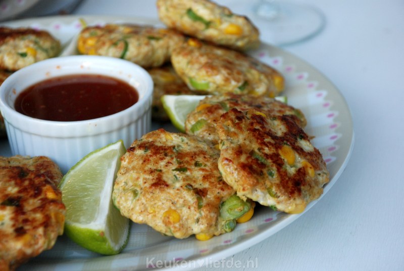 Ik ben echt dol op deze verrukkelijke koekjes van kipfilet, garnalen en zoete maiskorrels! Je serveert ze met een pittige, zoete chilisausdip en partjes frisse limoen die dit gerecht helemaal afmaken.