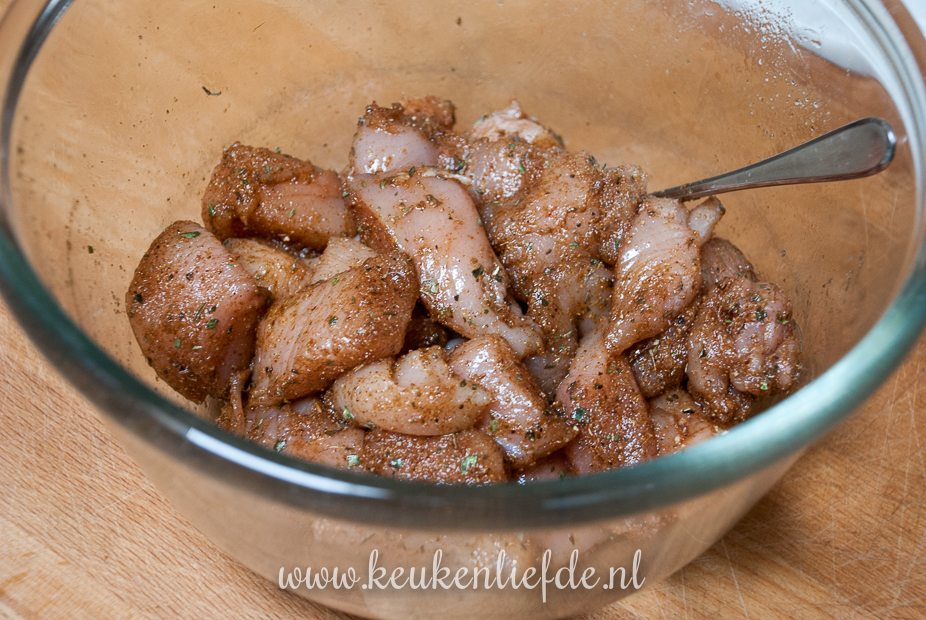 Houd rekening met een marinadetijd van minimaal 2 tot maximaal 24 uur. Ik marineer de kip altijd een dag van tevoren, zodat alle smaken goed kunnen intrekken. Bovendien is dit gerecht dan op de dag zelf in een handomdraai klaar. Extra genieten dus.