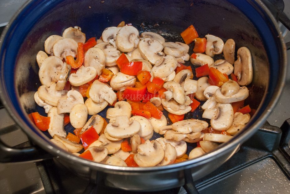 - 250 g champignons, schoongeborsteld en in plakjes gesneden