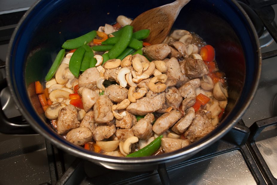 Voeg indien nodig een extra scheutje olie toe aan de hapjespan en bak de paprika en champignons op hoog vuur, totdat ze licht beginnen te kleuren. Voeg dan de sugar snaps, cashewnoten, kippenbouillon, oester- en sojasaus toe. Breng aan de kook en laat kort even doorpruttelen, totdat alle ingrediënten door en door warm zijn en de kip gaar is.