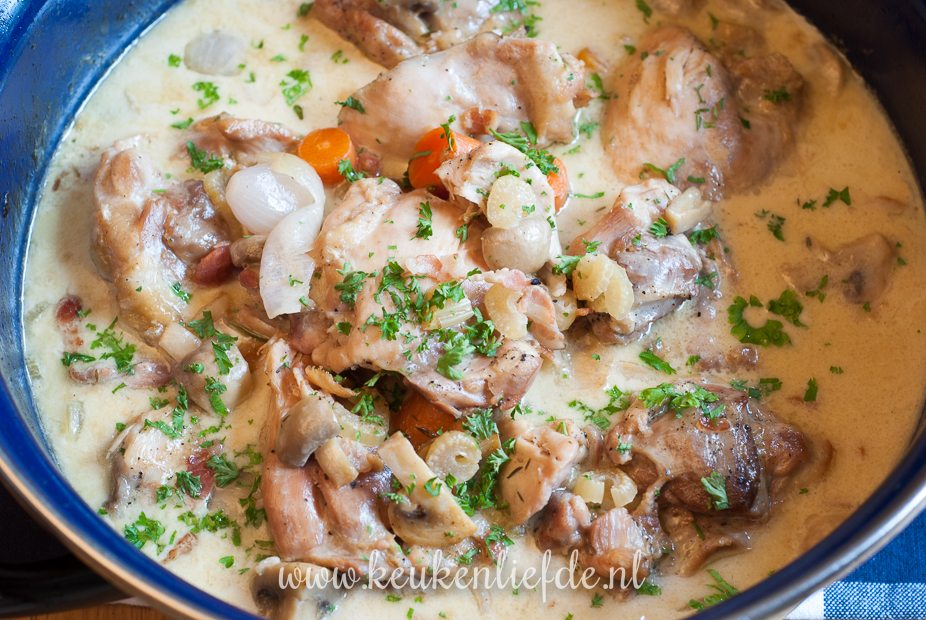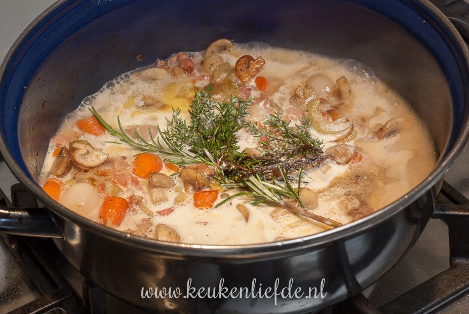 De saus zal vrij dun blijven, omdat deze niet gebonden is. Het is heerlijk om vers brood bij dit gerecht te serveren en hier het verrukkelijke stoofvocht mee op te deppen. Wil je liever een wat dikkere saus, voeg dan tijdens het bakken van de groenten 1 à 2 eetlepels bloem toe en bak circa 2 minuten mee om te laten garen. Voeg vervolgens de wijn en room toe.